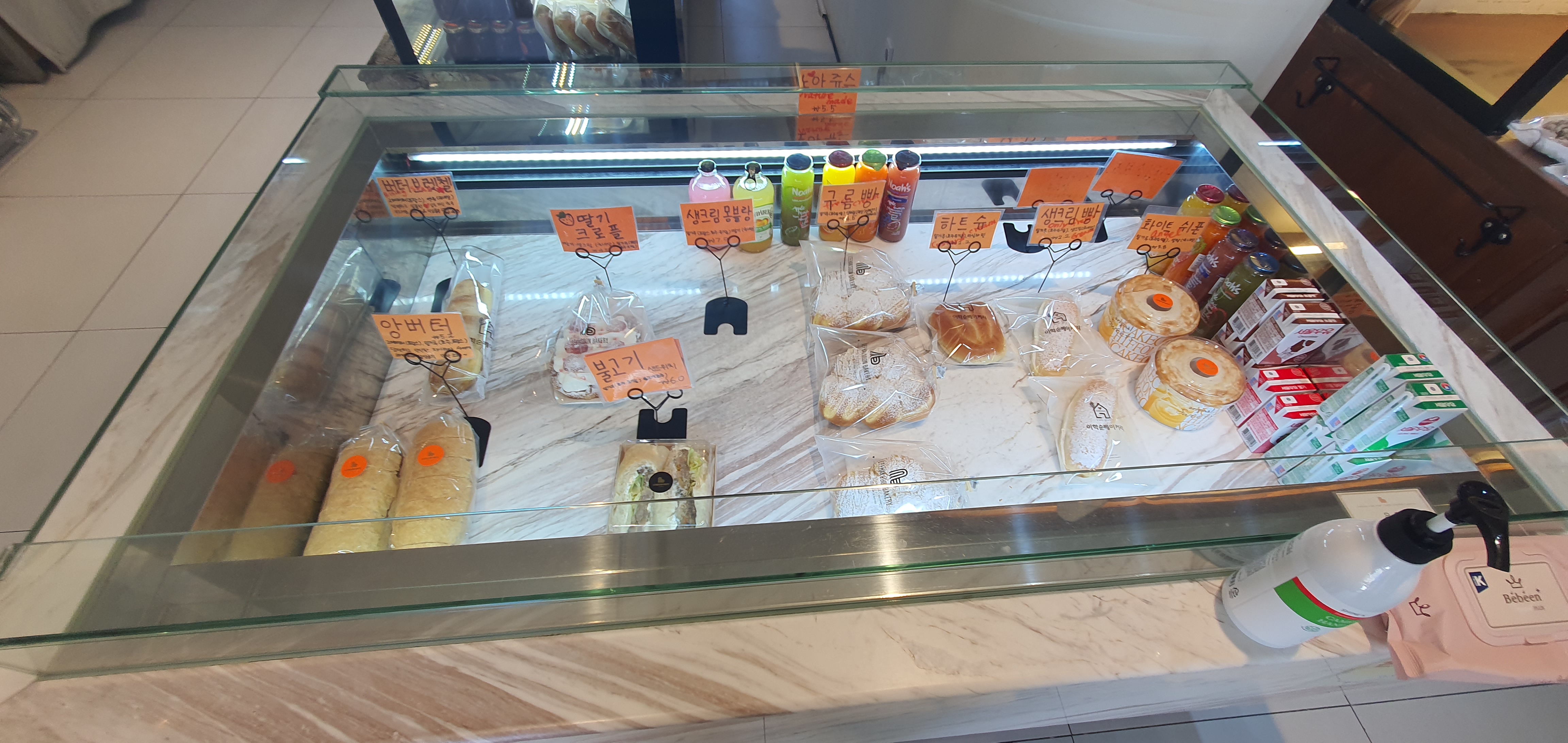 빵의 종류가 엄청나게 다양하다. 샌드위치, 크림빵, 바게트 등등... 빵들은 당일 그날그날 만드는 것처럼 보였다. 여기서 추천해줄 만한 빵은 바게트 빵과 생크림 빵이다.