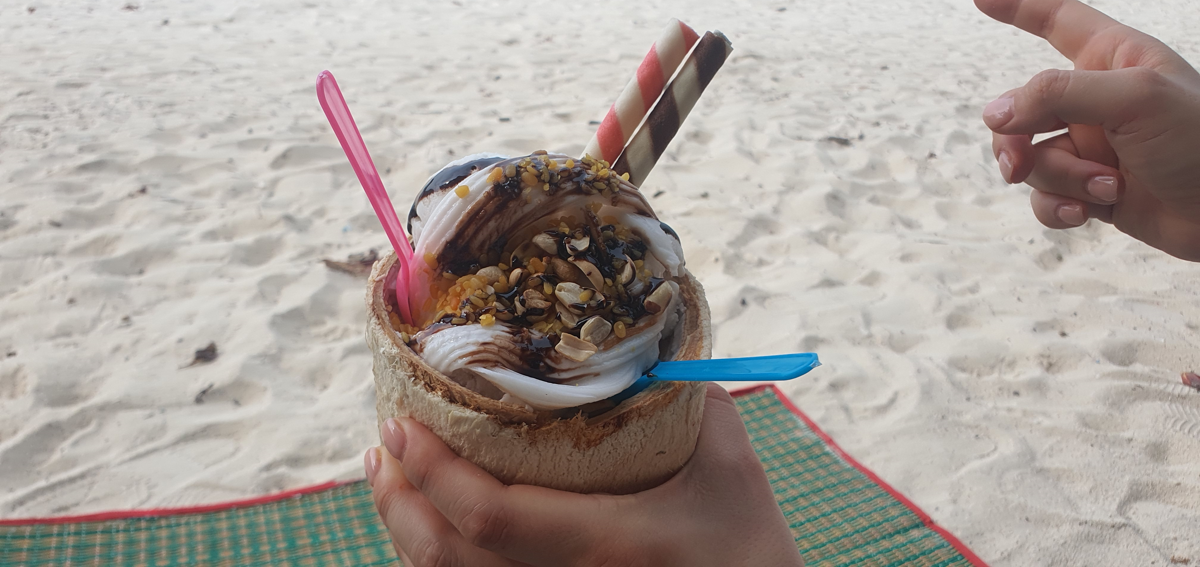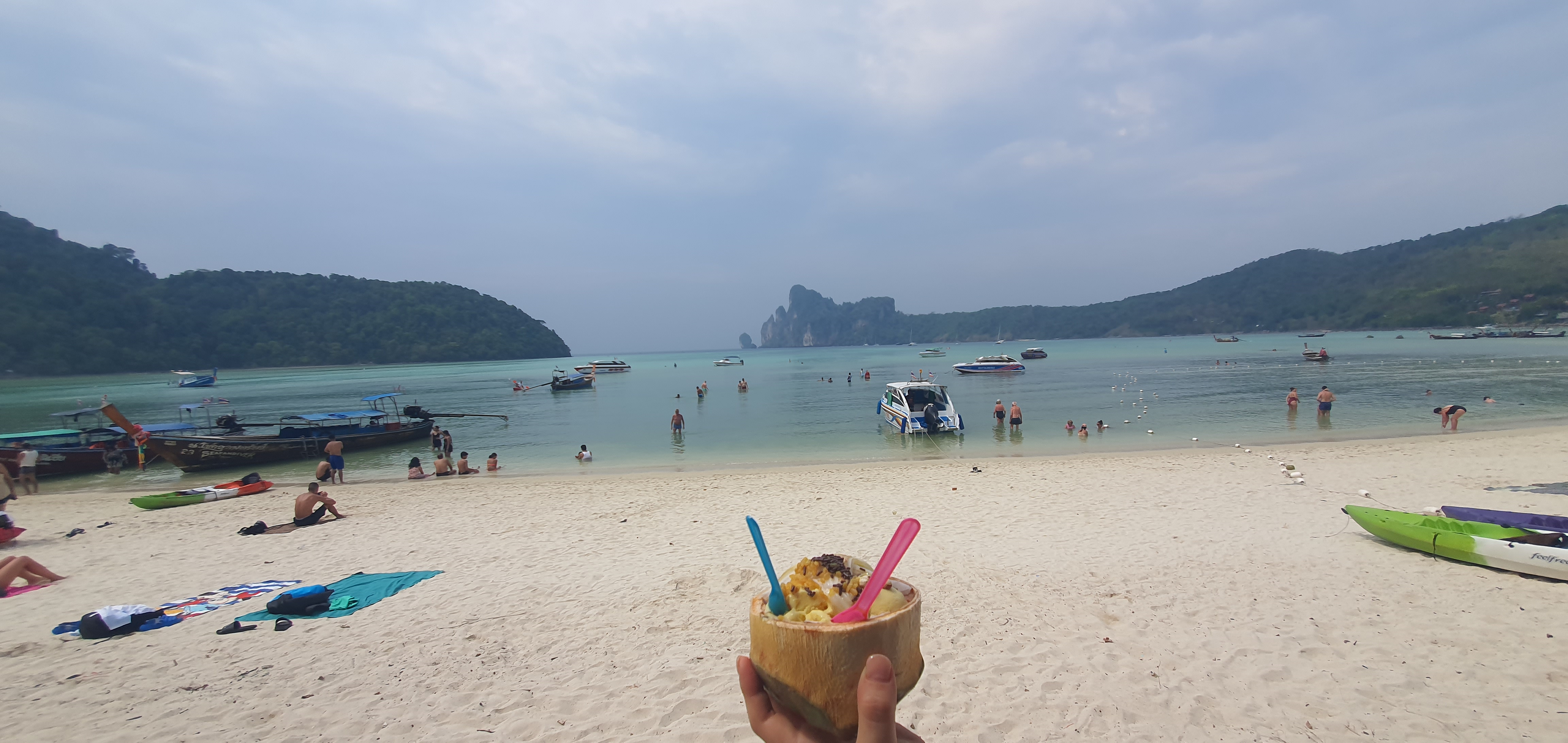 피피섬에 도착을 하면 이 코코넛 아이스크림을 꼭 먹어보는 것을 추천한다. 우리나라에서 파는 베라나 뭐 롯데에서 만든 아이스크림과 다르게 굉장한 깊은 맛이 느껴진다. 가격은 100밧으로 3800원정도 하고 너무 맛있어서 하루에 한 번씩은 꼭 먹었다. 특히 아이스크림의 깊은 맛뿐만 아니라 토핑의 맛도 일품이었다. 땅콩이랑 이것저것 바삭바삭한 과자 같은 게 들어가는데 조합이 미쳤다.