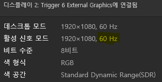 USB to HDMI를 연결한 모니터 설정 상에서 주사율은 60Hz로 나와있다. 무선으로 모니터를 확장하는 경우에는 보통 주사율이 반토막이 난다. 내가 사용하는 2대의 모니터 모두 FHD를 지원하는데 FHD는 1920 * 1080의 해상도를 갖고 있다. 이 말은 디스플레이 도트의 개수가 1920 * 1080 = 2,073,600개가 있다는 뜻이다. 60Hz는 1초에 60번을 움직이니 1920 * 1080 * 60 = 124,416,000가 될 것이다.