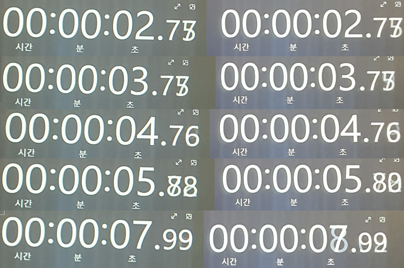 왼쪽이 USB to HDMI이고 우측이 HDMI이다. 무선으로 하는 경우 시간 차이가 엄청 크게 나는데 해당 제품의 경우 반응차이가 거의 없는 것으로 보인다. USB to HDMI의 초가 7.99를 가리키고 있을 때 HDMI는 벌써 8초로 바뀌려고 하는 것으로 보니 100ms 정도 차이가 있을 것 같다. 반응속도 차이는 거의 없다고 봐도 무방할 것 같고 사용하는 내 입장에서도 차이가 안 느껴진다.