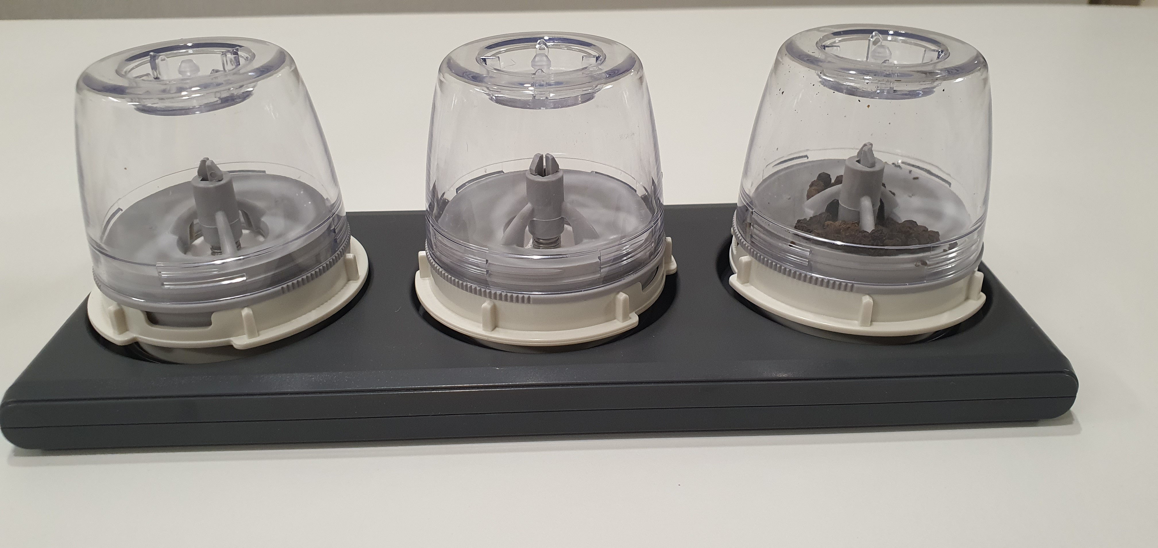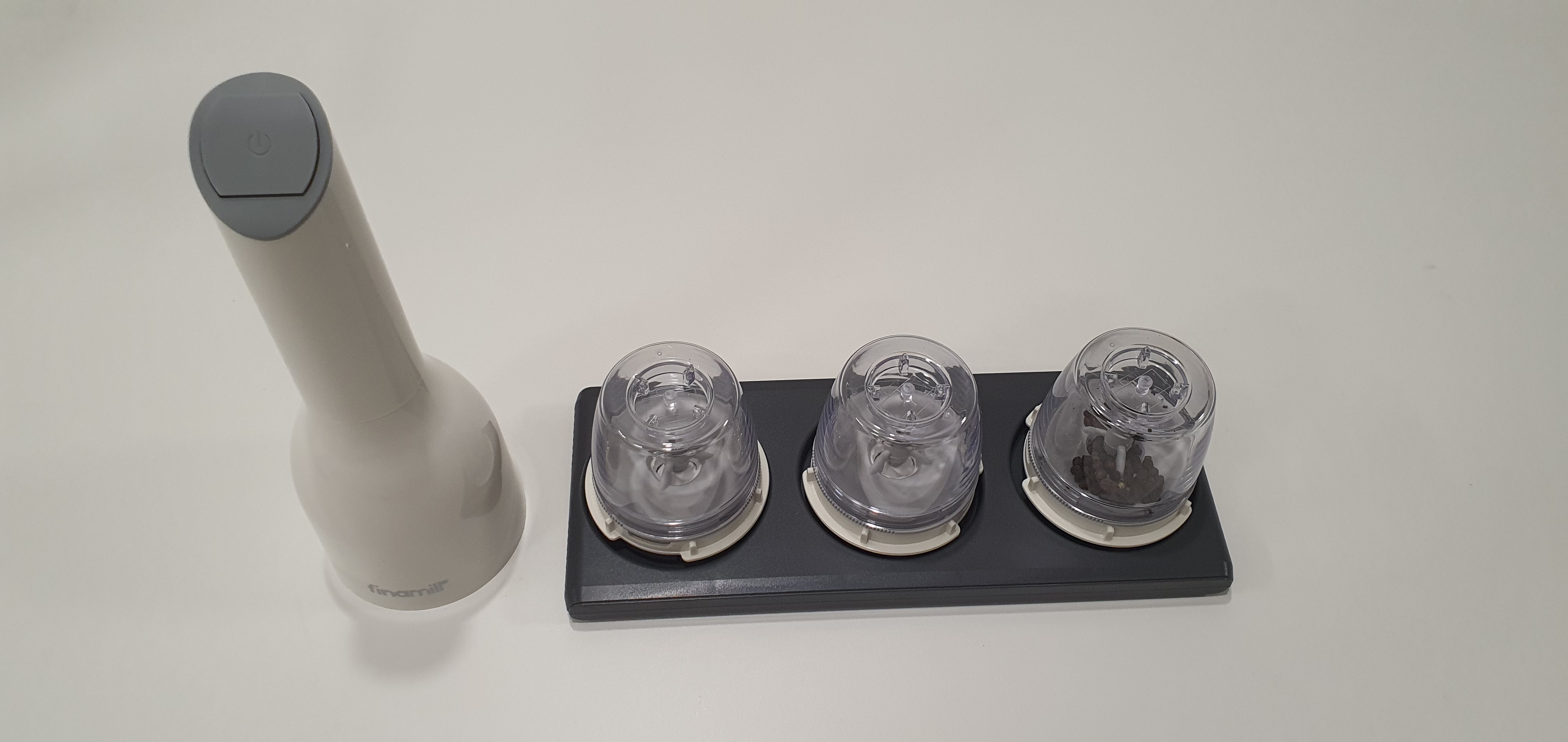 향신료 통같이 생긴 게 프로플러스팟이라고 부르는 것인데 기본 제품은 그라인더 + 프로플러스팟 2개를 준다. 위에 제품구성품은 세트라서 그라인더 + 프로플러스팟 3개 + 트레이 + 소금 + 통후추 이렇게 된다.