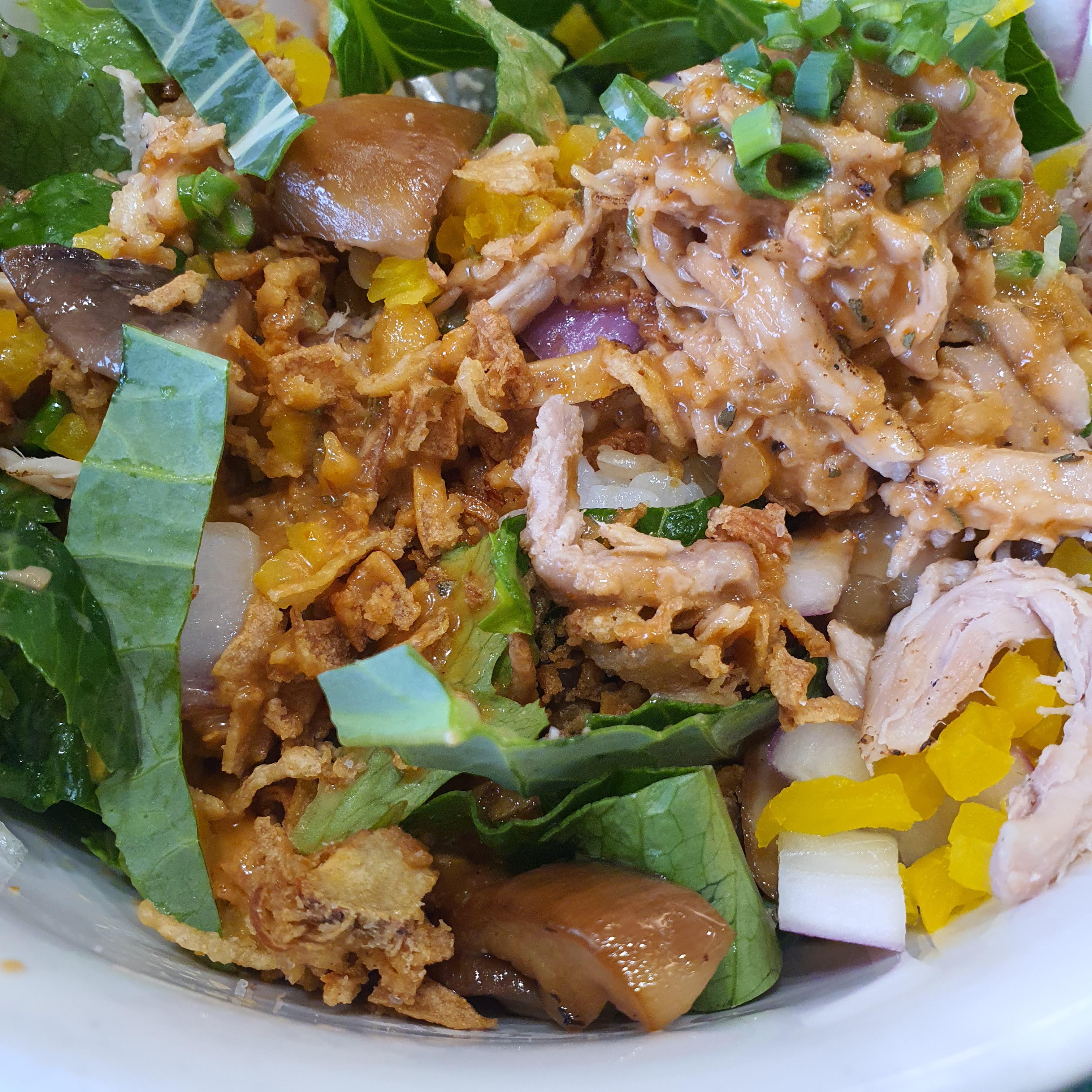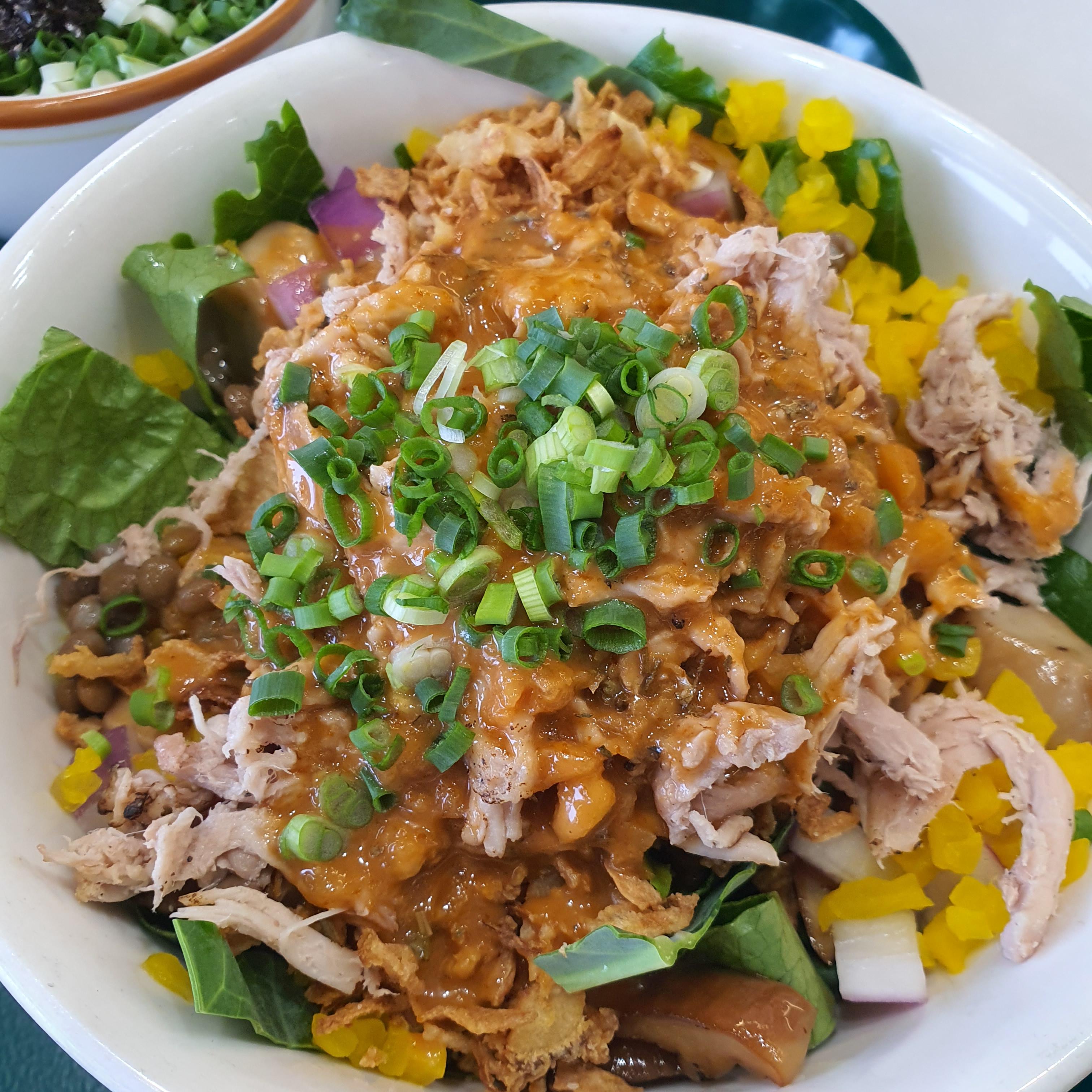 핫돼지텃밭은 비빔밥인데 소스가 고추장이 아닌 된장 베이스에 소스이고 우리고 흔히 알고 있는 된장맛이 아니라 덜 짜고 달달하게 만든 맛있게 만든 된장소스이다.