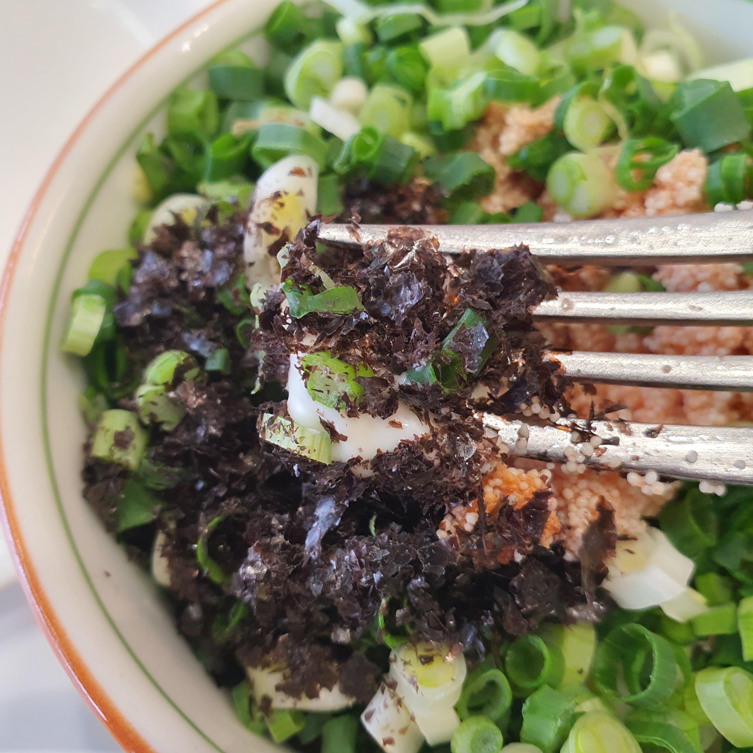 김가루, 들기름, 쪽파 명란 그리고 마요네즈 등이 들어간 것으로 보인다.