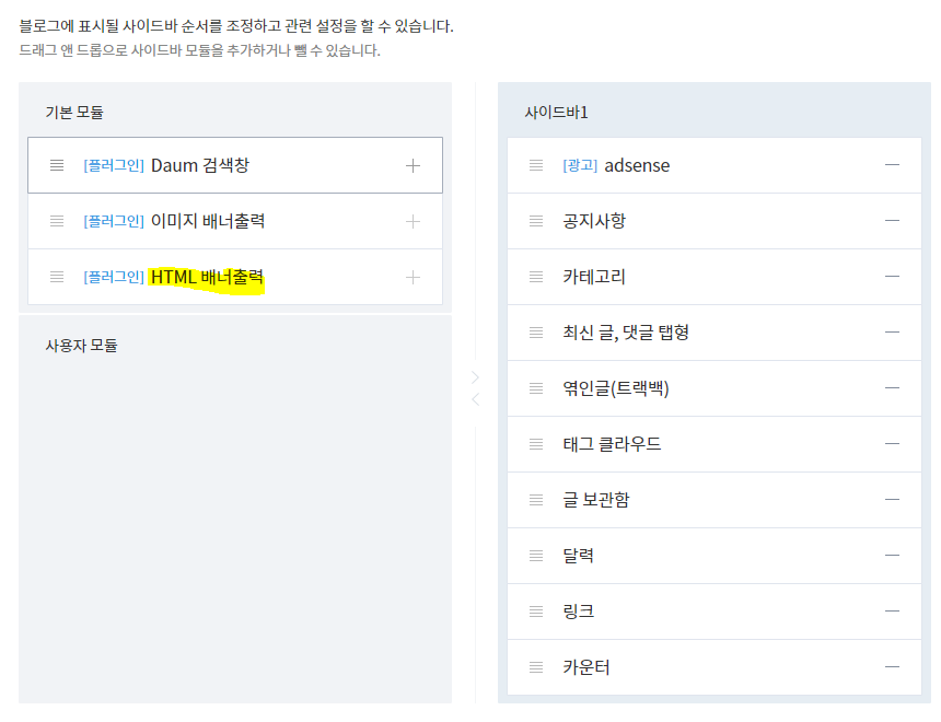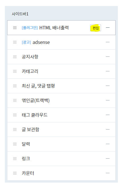 우측은 현재 사이드바에 사용하고 있는 목록들입니다. HTML 배너 출력을 추가해줍니다.