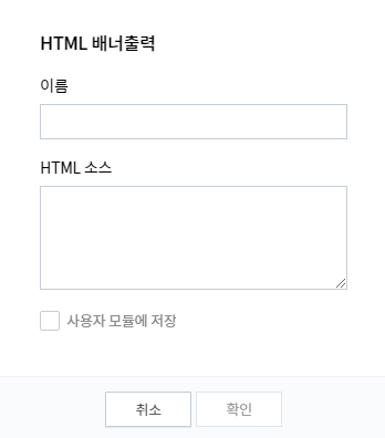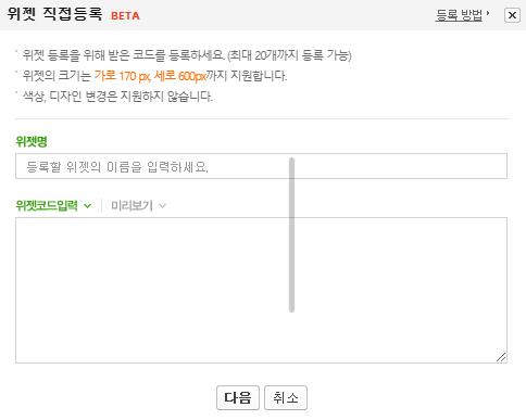 위젯 직접 등록을 클릭하면 위에와 같이 팝업창이 뜨는데 여기 원하는 이름을 넣고 코드를 입력하면 됩니다.