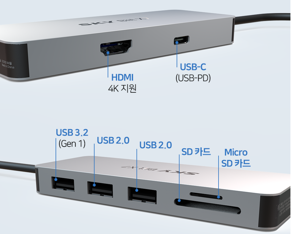 우선 구성품은 허브와 설명서가 들어있습니다. 허브 정면에는 스카이 로고와 함께 제품 이름이 쓰여있네요. 겉에 하우징은 알루미늄과 ABS입니다. 이런 허브의 경우 발열이 약간 발생하기 때문에 ABS하우징 보단 알루미늄 하우징이 대부분입니다.